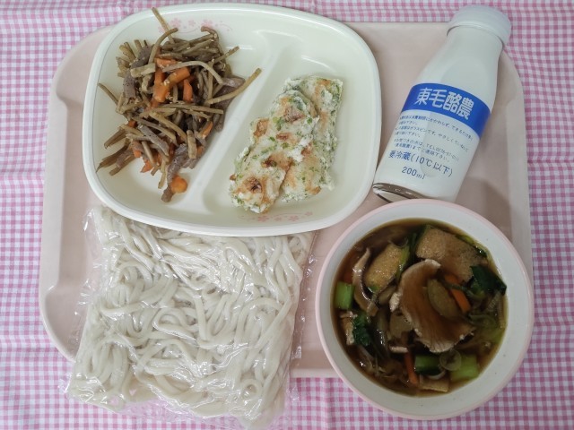 うどん 牛乳 ミルメークコーヒー ちくわの磯辺揚げ きんぴら なすと豚肉のうどん汁