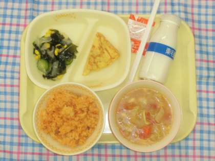 今日は玉中のリクエスト「チキンライス」でした。本当はオムライスがリクエストだったのですが、給食では難しいためチキンライスとオムレツを組み合わせてみました。冬野菜のミネストローネスープには玉村産の大根を使いました。おいしいスープになりました。