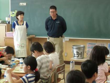 仕事をしていて大変なことやうれしいことをうかがいながら一緒に給食を食べてもらいました。自然相手の仕事はお天気に気を使いながらの作業だそうです。雨が降りすぎても身割れを起こし、商品価値がなくなってしまいます。おいしく食べてくれることがうれしいということなので、今日は子供たちが食べる様子を見てもらえてよかったです。