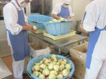 今日から 上陽地区の峯岸惠美子さんの玉ねぎです。肉じゃがとみそ汁の両方に入ります。こだわりの農法で作ったおいしい玉ねぎはまん丸で恵美子さんの人柄を表しているようです。