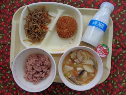 日本では古くから赤い色には悪い物を追い払う力があると考えられています。そのため、魔除けの意味でお祝いの時にお赤飯が食べられるようになりました。最近では、お祝いごとのために用意することも少ないと思いますが、給食センターからのお祝いの気持ちが伝わるとうれしいです。